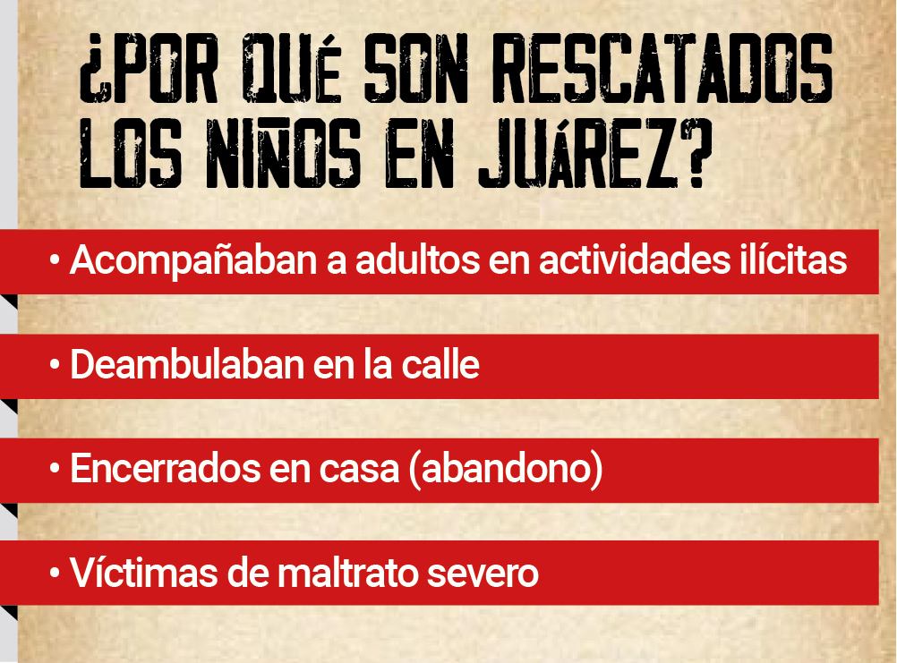 Algún pariente los llevaba consigo mientras vendía droga, trasladaba armas o se embriagaba. También había niños y adolescentes que deambulaban en las calles o permanecían encerrados bajo llave en sus casas (omisión de cuidados o abandono). En otros casos, los menores eran objeto de maltrato severo y alguien tuvo la valentía de hacer un reporte anónimo para que los agentes acudieran a sacarlos de ese entorno peligroso.