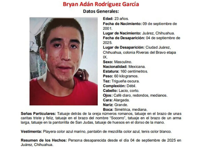 El pasado 4 de septiembre fue la última vez que alguien vio a Bryan Adán Rodríguez García caminar por las calles de Riveras del Bravo, etapa IX. Desde entonces, el joven de 23 años se convirtió en un nombre más en las listas de desaparecidos de Ciudad Juárez, pero para su familia es mucho más: un hijo, un hermano, un rostro que no quieren que se borre entre el silencio.