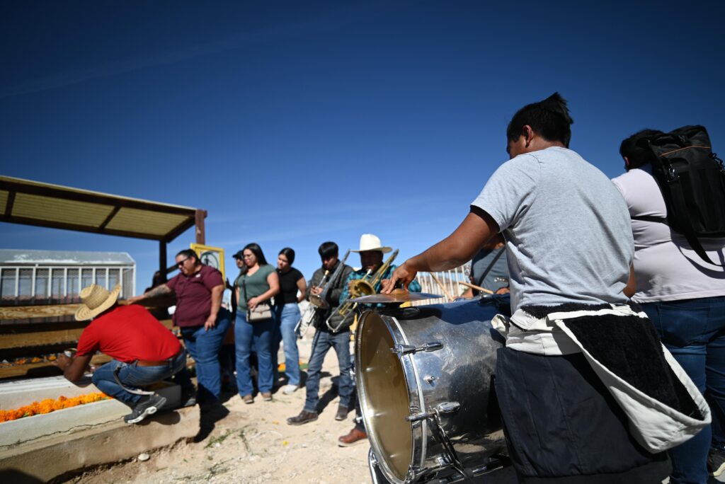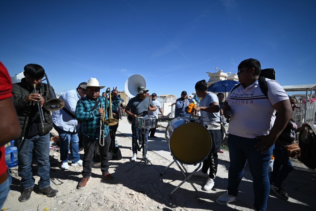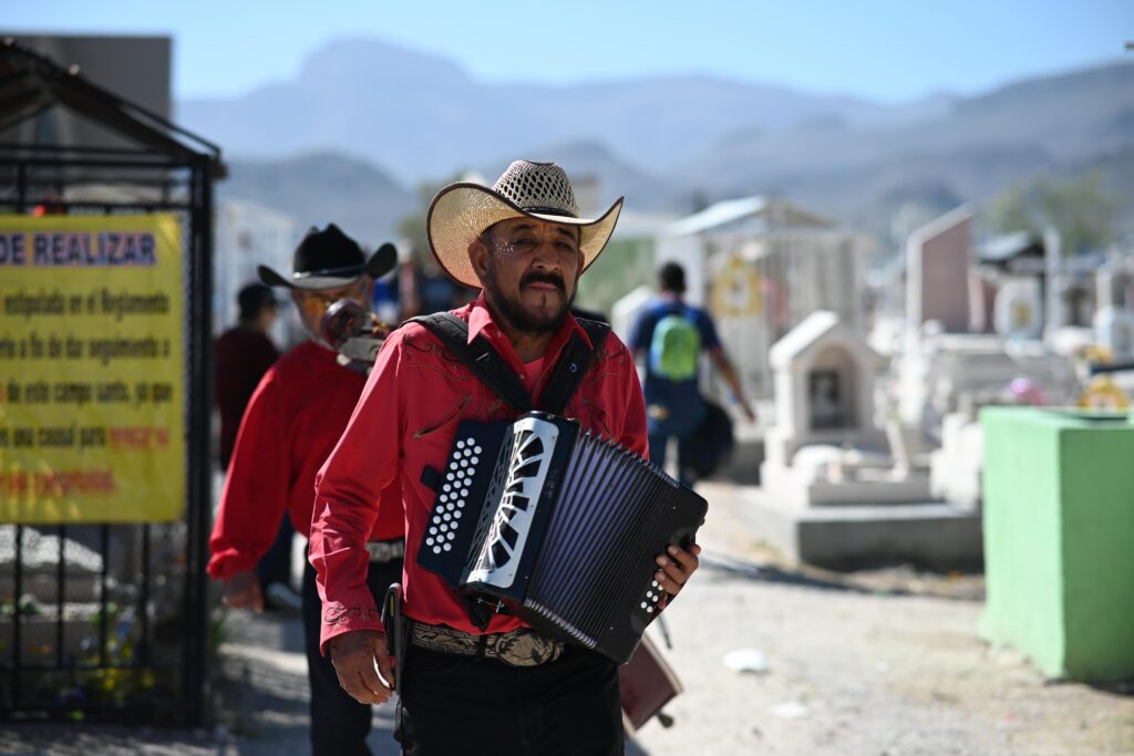 Además, no puede faltar el acompañamiento musical y son notorias aquellas bandas de música de norteña, que van paseando con sus instrumentos por los pasillos del panteón y que amenizan, a “precios económicos”, la conmemoración luctuosa del ser querido con una, dos, o más canciones que eran de su gusto cuando la persona estaba en vida.