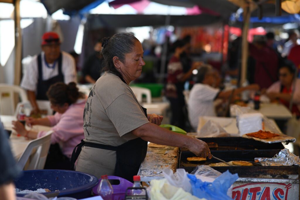 En la entrada principal destacan los puestos de adornos florales y ramos de cempasúchil que llenan el ambiente con su olor tan característico, que contrasta con el aroma del chile, el aceite y el maíz que componen el puesto de enchiladas que se encuentra a un costado.