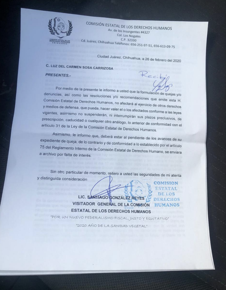 La queja de Sosa fue recibida por el visitador Santiago González Reyes en la sede de la CEDH de esta frontera.