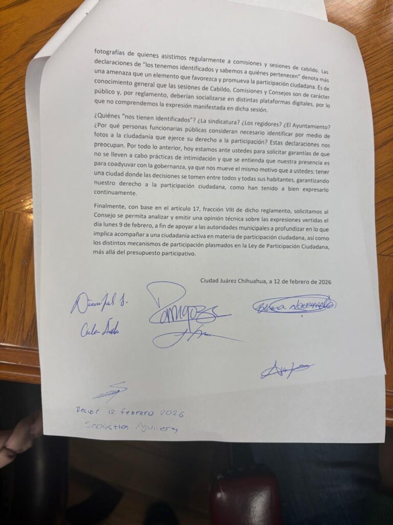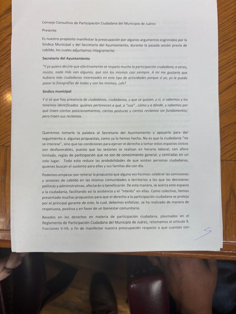 En la reunión también intervino Diana Solís, presidenta del Consejo Consultivo de Participación Ciudadana del Estado, quien consideró inadecuada la conducta de los funcionarios señalados y recordó que el Consejo Consultivo de Juárez mantiene desde hace un año tres consejerías ciudadanas acéfalas.