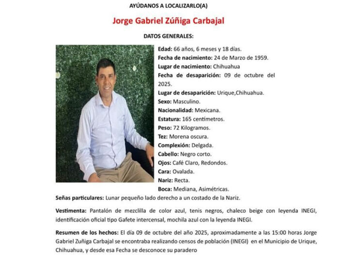 El encuestador del Instituto Nacional de Estadística y Geografía (Inegi), Jorge Gabriel Zúñiga Carbajal, continúa desaparecido luego de ocho días de haber salido a realizar trabajos censales en el municipio de Urique.