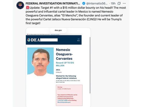 La agencia antidrogas de EU mantiene vigente la recompensa por información que lleve a la captura del presunto líder del Cártel Jalisco Nueva Generación, considerado uno de sus principales objetivos
