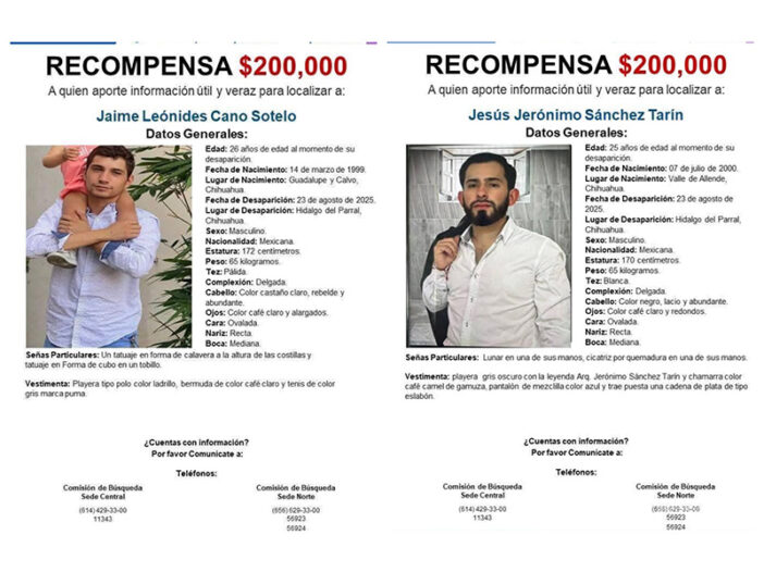 Jesús Gerónimo Sánchez Tarín y Jaime Leónides Cano Sotelo fueron reportados como desaparecidos desde el 23 de agosto de 2025 en Hidalgo del Parral, en un caso que permanece sin esclarecer y que ha generado presión social y exigencias públicas hacia las autoridades estatales.