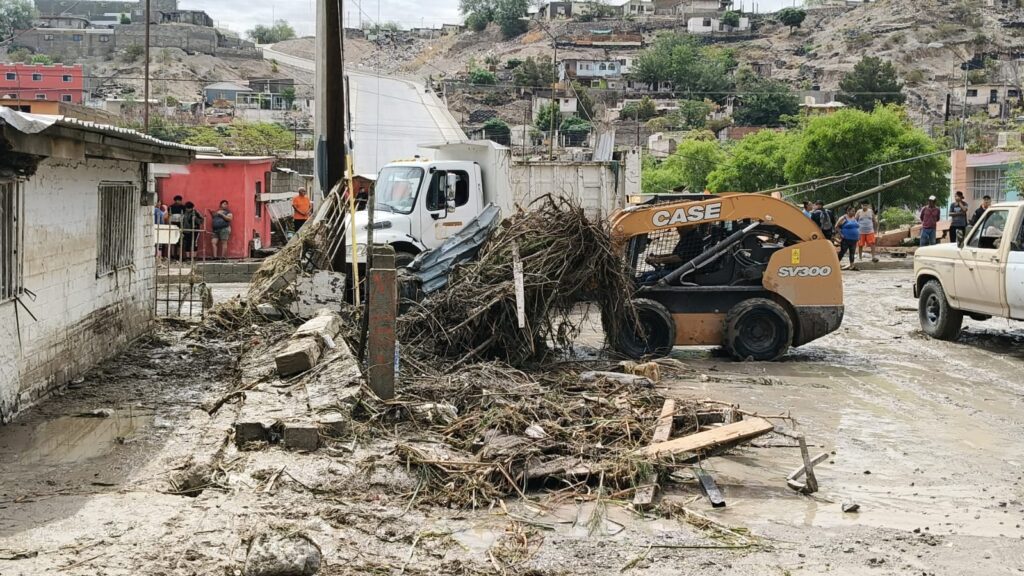 A la vez, empleados de diversas dependencias municipales continúan trabajando de en el poniente de la ciudad para ayudar a las familias afectadas con labores de limpieza sobre la calle Juan José Méndez en la colonia Fronteriza Baja para retirar tierra de arrastre y escombro con maquinaria pesada como trascabo, mini cargador y camiones de volteo.
