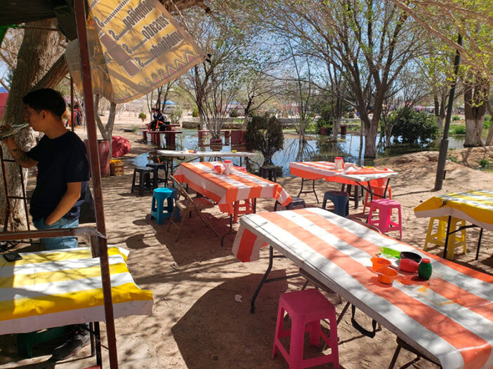 Incluso los locatarios colocan mesas y sillas en el mismo terreno donde está el agua encharcada, despidiendo olores fétidos todo el día.