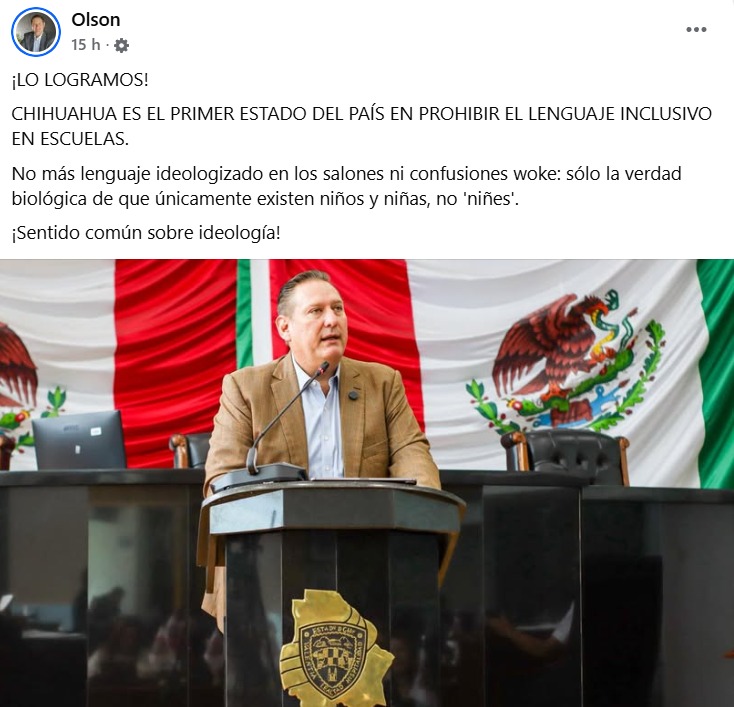 “¡LO LOGRAMOS! Chihuahua es el primer estado del país en prohibir el lenguaje inclusivo en escuelas. No más lenguaje ideologizado en los salones ni confusiones woke: solo la verdad biológica de que únicamente existen niños y niñas, no ‘niñes’. ¡Sentido común sobre ideología!”, publicó Olson en sus redes sociales.