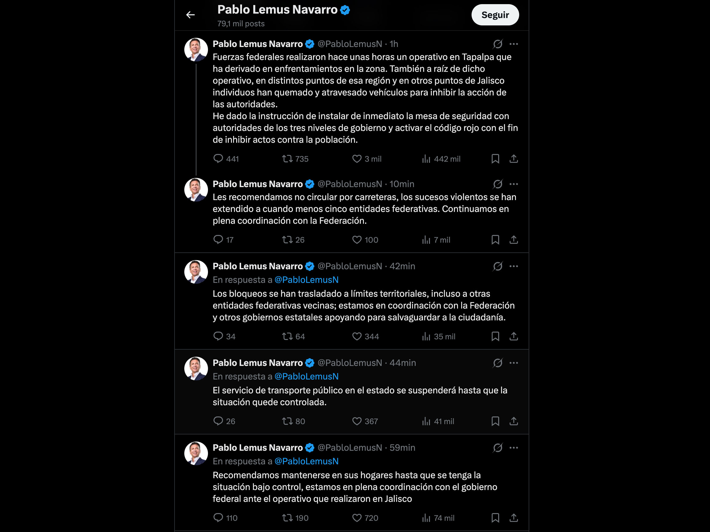 El gobernador Pablo Lemus confirmó la activación del Código Rojo en todo Jalisco, instaló de inmediato una mesa de seguridad con autoridades de los tres órdenes de gobierno y llamó a la población a resguardarse en sus hogares, evitar traslados no esenciales y no difundir información no verificada.