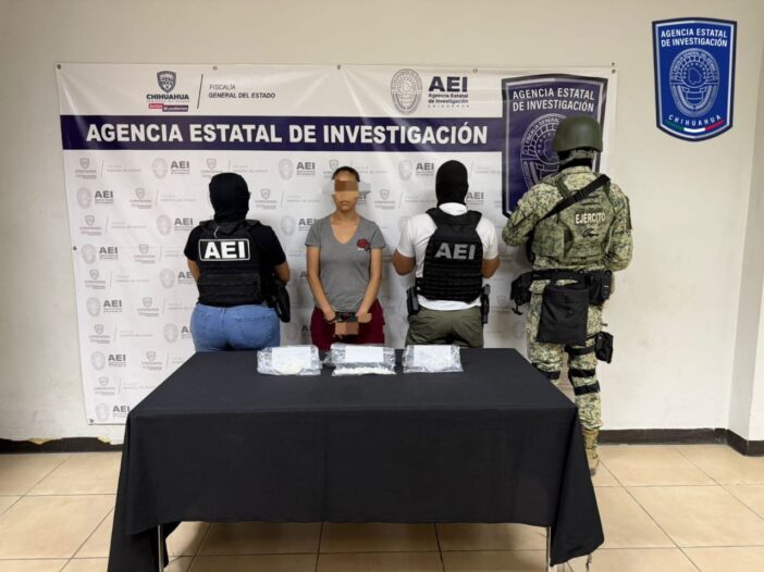 Elementos de la Agencia Estatal de Investigación (AEI), adscritos a la Fiscalía de Distrito Zona Norte, detuvieron en flagrancia a Karen Magdalena B. B., de 32 años, por su presunta responsabilidad en delitos contra la salud, al ser sorprendida con más de mil dosis de cocaína durante un operativo conjunto con el Ejército Mexicano.