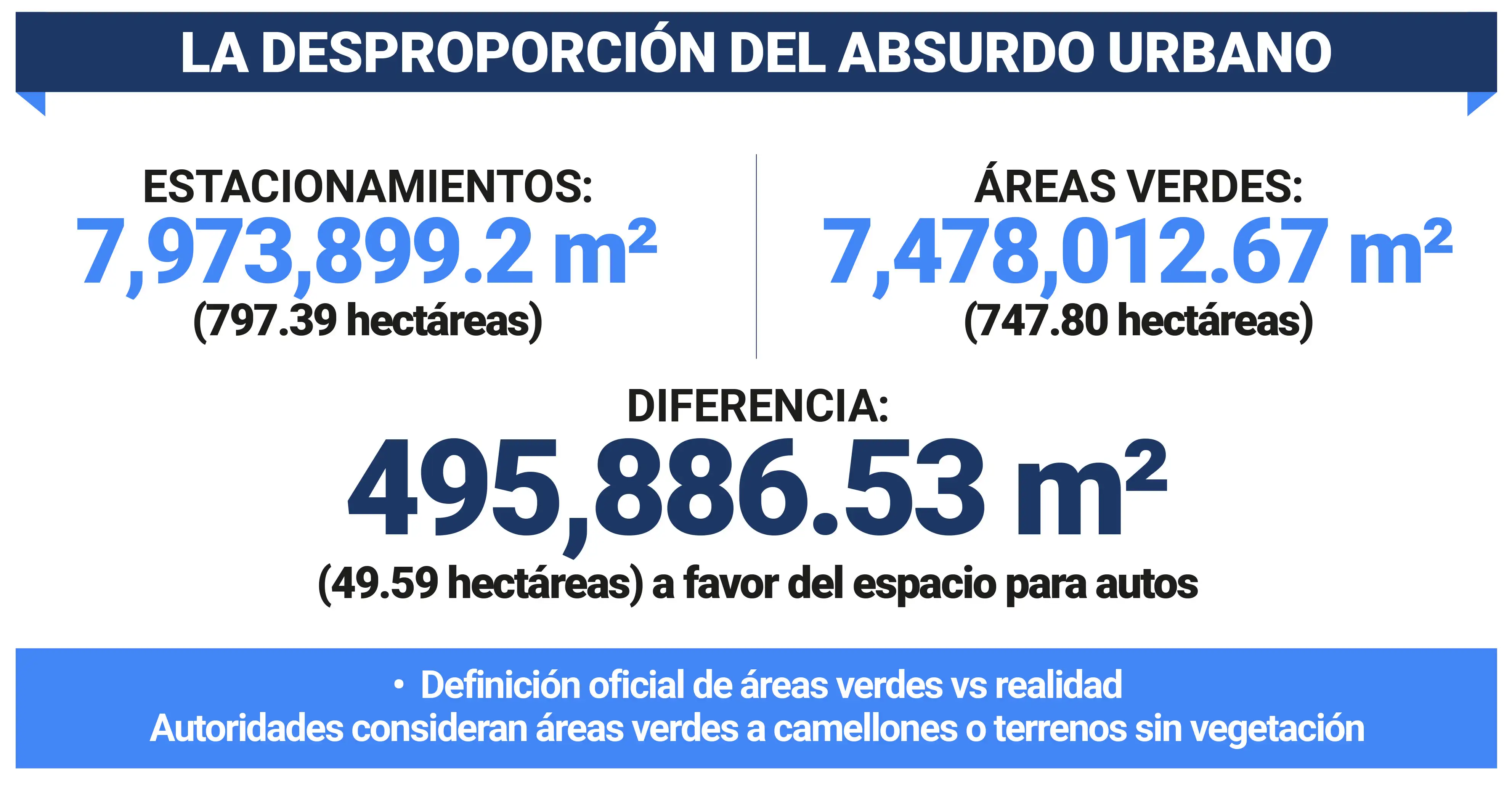 Se calculó el área utilizada solo por el automóvil que “duerme” en las casas, pero no hay estudios para saber cuántos cajones de estacionamiento existen en la ciudad. Faltaría calcular el terreno que se usa en oficinas, supermercados, cines o escuelas, ya que un solo vehículo ocupa varios espacios.