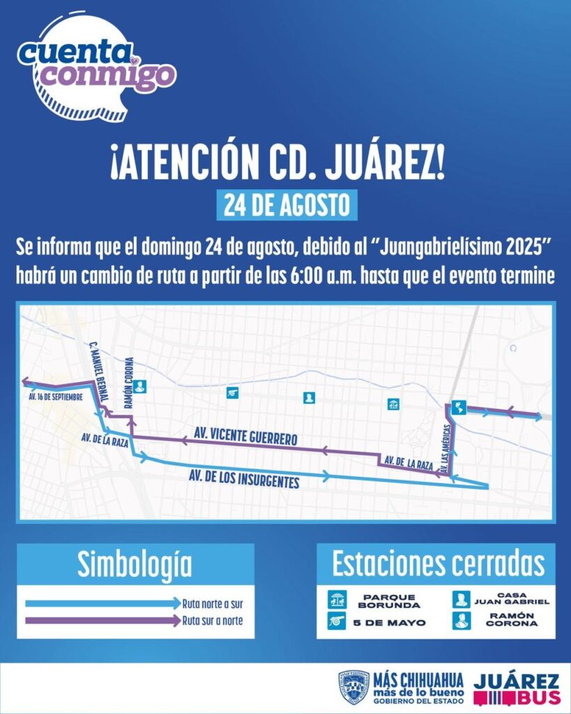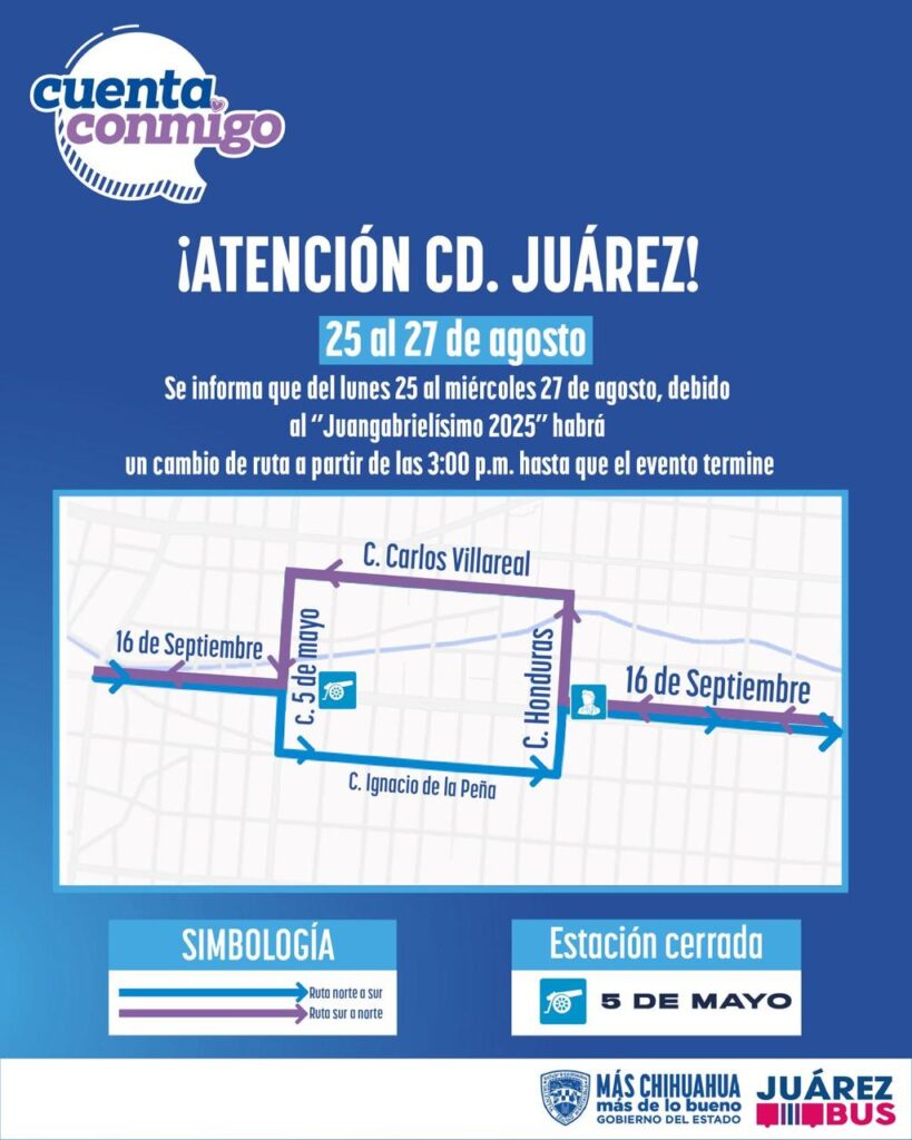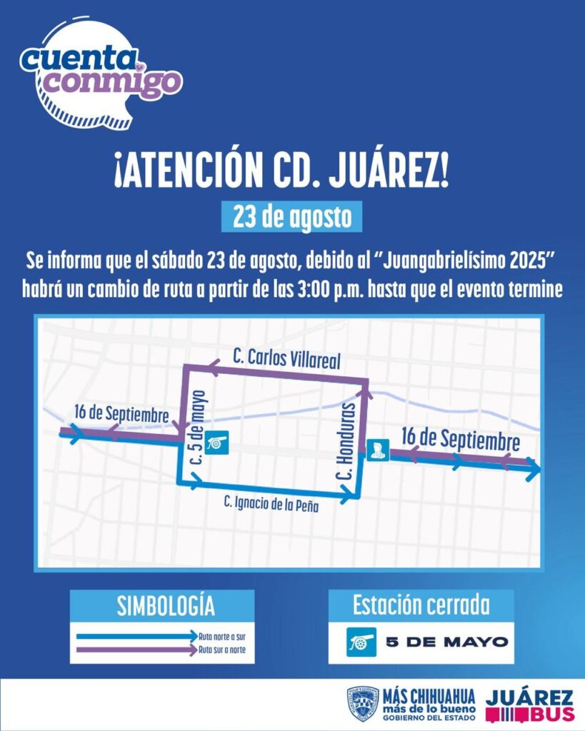 Personal de la Secretaría General de Gobierno, a través de la Operadora de Transporte (OTV), informó que el motivo de estas modificaciones, que no son permanentes, son las actividades del Juangabrielísimo 2025 a partir de este día y hasta el 27 de agosto.
