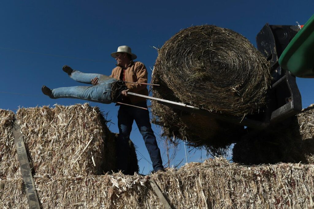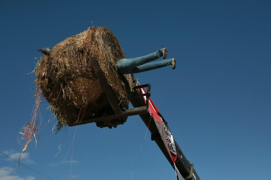 En el corazón del montaje está el símbolo central: una paca suspendida por una grúa, de la que sobresalen dos piernas con botas y mezclilla. Es la figura de un campesino siendo “engullido” por el forraje.