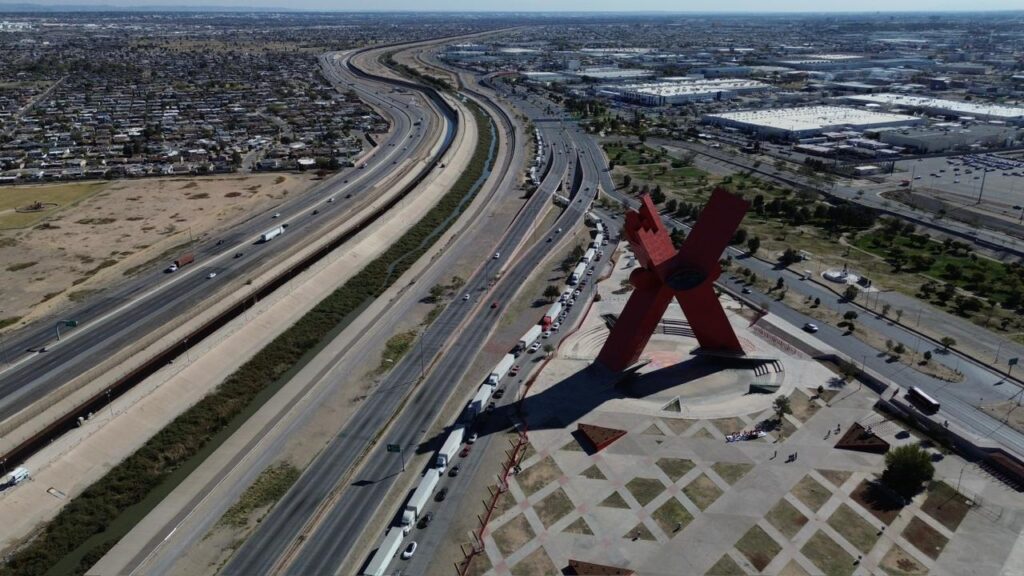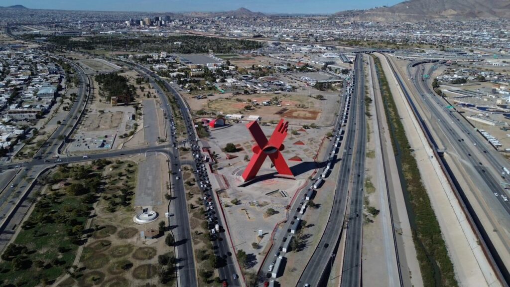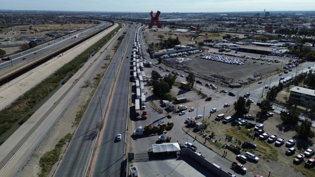 Las tomas aéreas captadas por el fotoperiodista de Norte Digital, Christian Torres, muestran la magnitud del cierre: una fila de tráileres detenidos serpentea por el bulevar Juan Pablo II, rodea la X de Sebastián y se extiende varios cientos de metros, paralela al río Bravo.