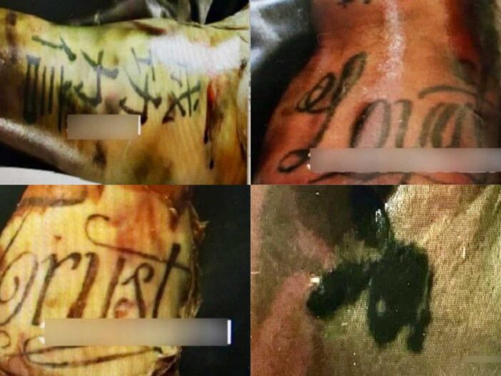 También tenía un tatuaje en el dorso de la mano izquierda con la leyenda “trust”; tatuaje en el antebrazo derecho y antebrazo izquierdo con aparentes símbolos de género; tatuaje en el antebrazo izquierdo con dos siluetas y un aparente símbolo de género.