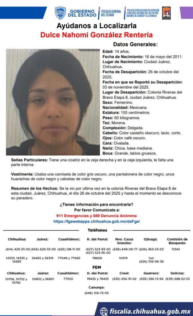 Familiares y autoridades de la joven Dulce Nahomi González Rentería, de 14 años de edad, solicitan el apoyo de la comunidad fronteriza para dar con su paradero, ya que fue vista por última vez el pasado 26 de octubre en Riberas del Bravo.