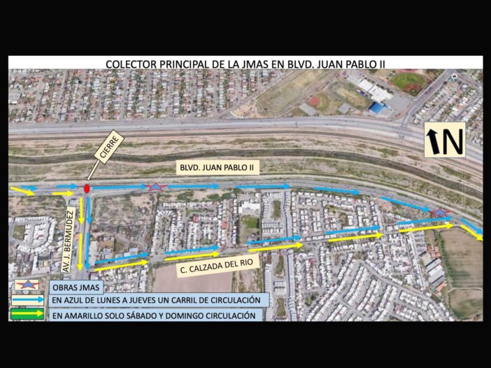 Esta medida obedece a los trabajos de mantenimiento que llevará a cabo la Junta Municipal de Agua y Saneamiento en el colector principal, motivo por el cual se realizará el cierre total del tramo comprendido entre la avenida A. J. Bermúdez y la Calzada del Río durante el próximo fin de semana, añade el reporte.