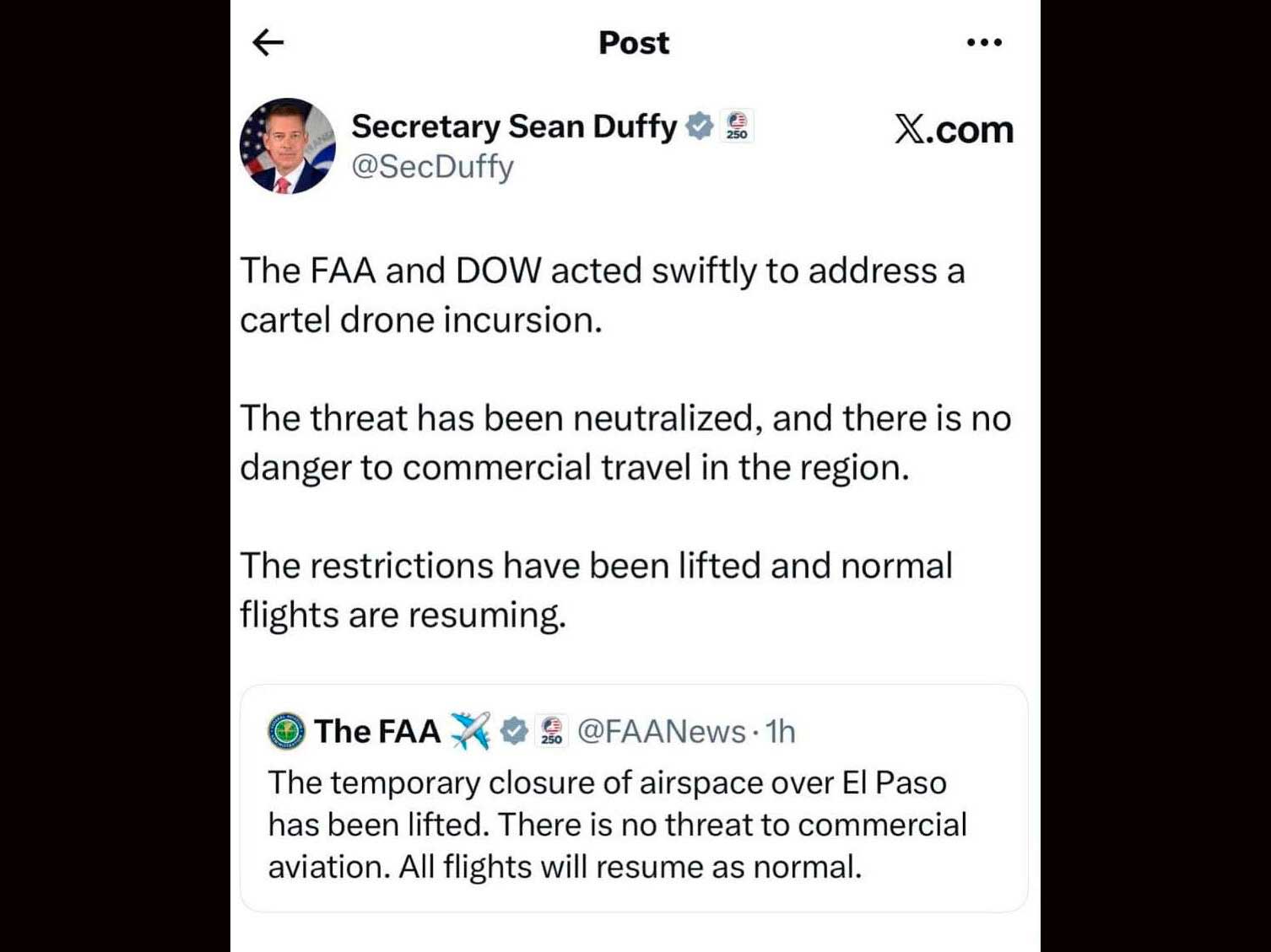 Confirma secretario incursión de dron ligado a cárteles en cierre aéreo de El Paso