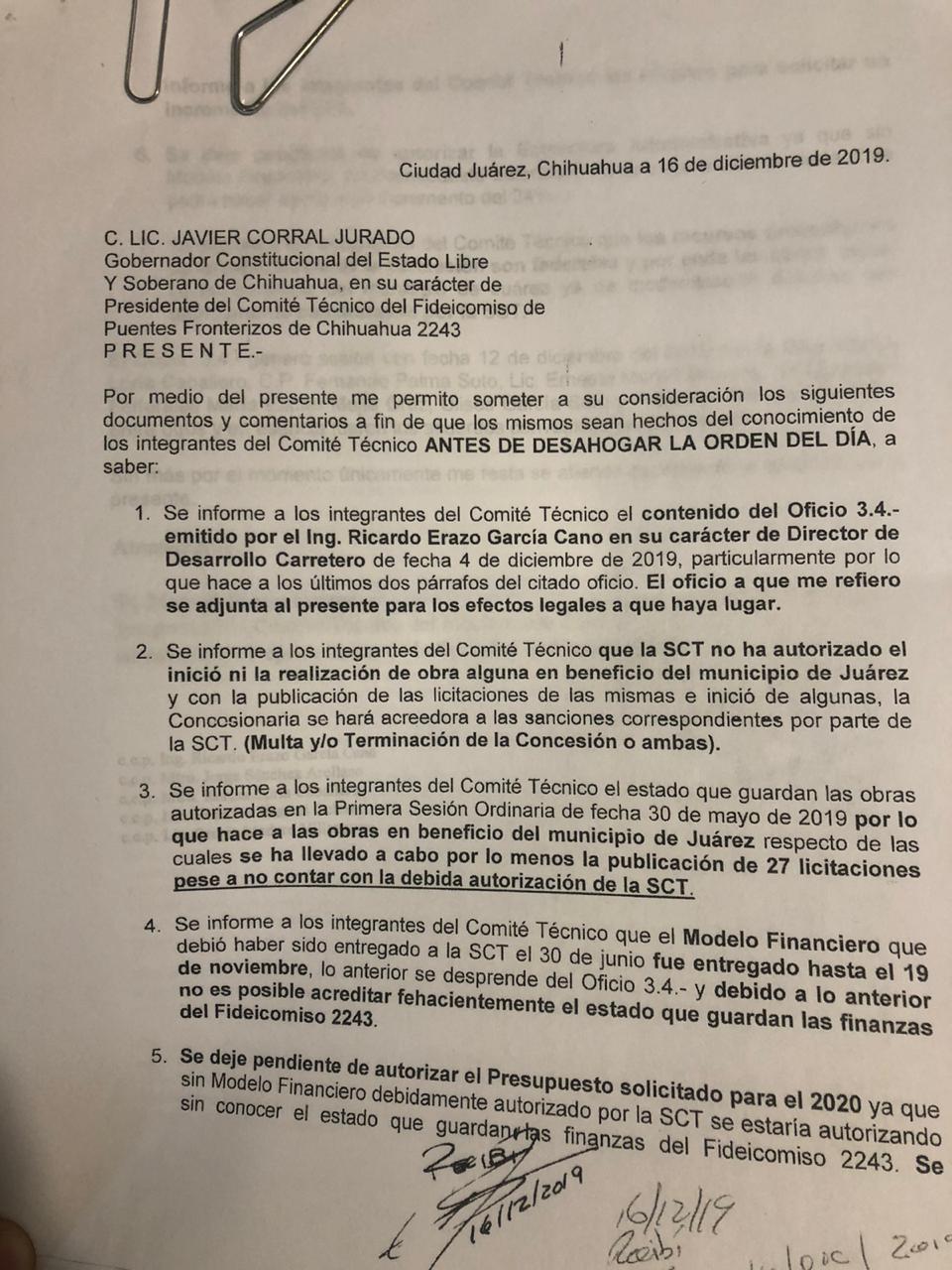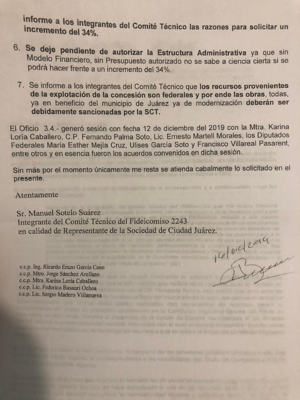 En su punto número uno el escrito de Manuel Sotelo advertía que el fideicomiso estaba incumpliendo términos del Título de Concesión, y que si no se hacían las correcciones necesarias, la Concesión podía ser retirada al estado de Chihuahua.
