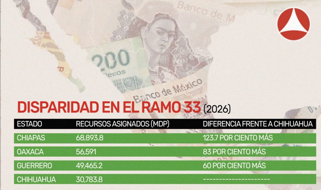 Para 2026, Chihuahua tendrá un aumento del 5.4 por ciento en partidas federales del Ramo 33 y recibirá 30 mil 783.8 mdp. Sin embargo, el alza no modifica su posición relativa frente a otros estados.