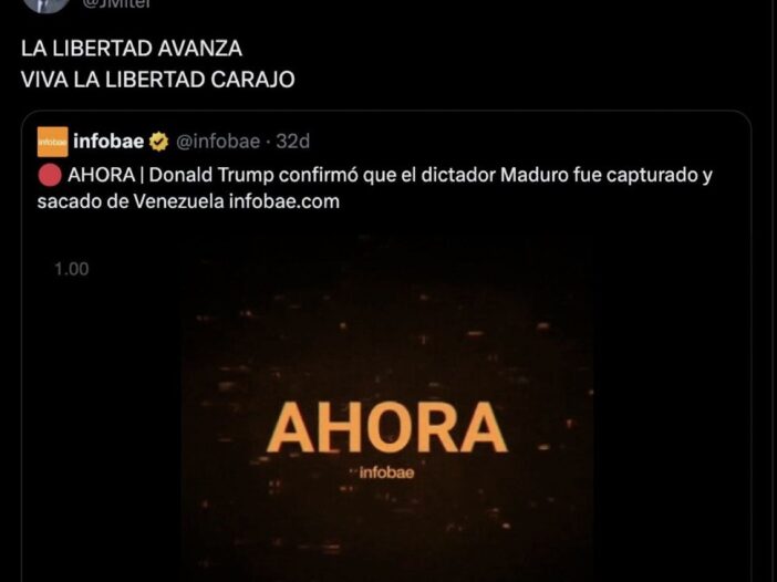 Javier Milei, celebró en sus redes sociales el anuncio del presidente estadounidense Donald Trump sobre la captura de Nicolás Maduro. En una publicación, Milei escribió: “La libertad avanza. Viva la libertad, carajo”, en respuesta a una nota difundida por Infobae.