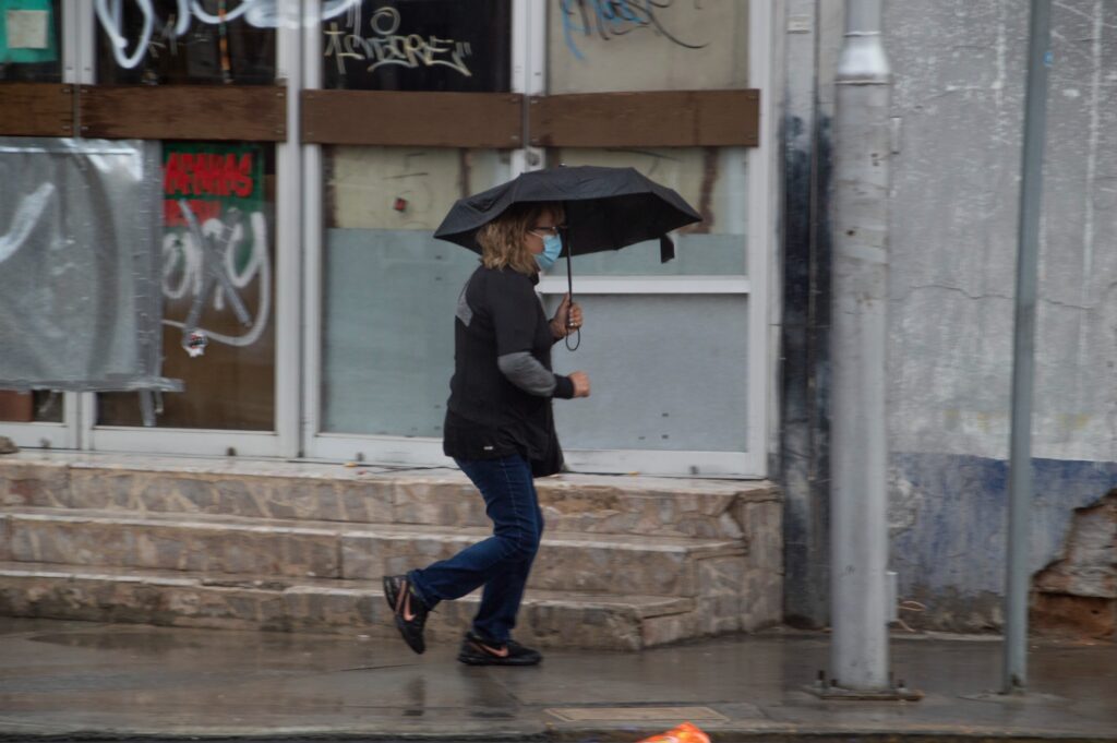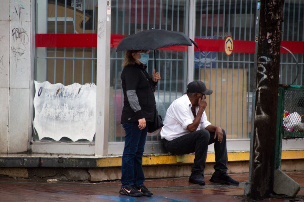 Mientras eso sucede, los peatones que transitan por el centro, con sombrillas, impermeables y cualquier cosa para cubrirse del agua que cae del cielo, caminan de un lado al otro buscando ese camión que los lleve a su destino o que los saqué del centro, que ya se volvió caótico sin que haya abierto ninguno de los negocios de la zona.