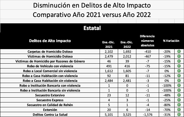 De igual manera, a nivel estatal, los feminicidios disminuyeron un 15 por ciento, con 46 en 2021 y 39 en 2022.