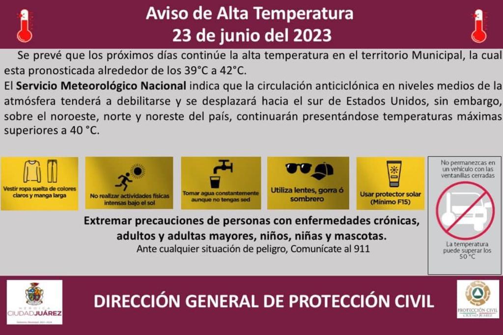 La Dirección General de Protección Civil emitió recomendaciones para que la ciudadanía adopte medidas de prevención contra riesgos a la salud, derivados de la onda calor que no bajará de los 40 grados centígrados en las próximas dos semanas.