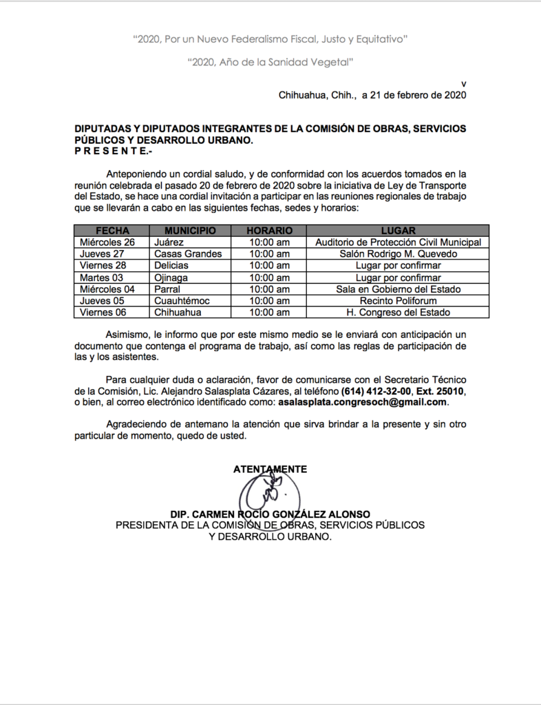 La semana pasada, la Comisión de Obras, Servicios Públicos y Desarrollo Urbano aceptó bajo presión de transportistas, organizar mesas regionales de discusión con el siguiente calendario: miércoles 26 de febrero en Ciudad Juárez; jueves 27 de febrero en Casas Grandes; viernes 28 de febrero en Delicias, martes 3 de marzo en Ojinaga; miércoles 4 de marzo en Parral; jueves 5 de marzo en Cuauhtémoc y viernes 6 de marzo en Chihuahua.
