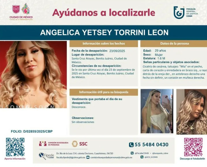 De acuerdo con el registro nacional de detenciones, la mujer, cuyo nombre real sería Angélica Yetsey Torrini León, fue aprehendida el pasado 23 de septiembre en la colonia Valle de los Pinos, municipio de Tlalnepantla de Baz, Estado de México. Tras su captura, quedó bajo resguardo del Ministerio Público.