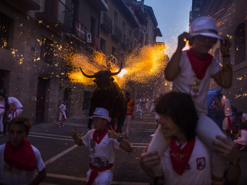 En el encierro diario, seis toros bravos recorren 850 metros desde un corral hasta la plaza de toros. Luego los lidian a muerte toreros profesionales en las corridas por la tarde