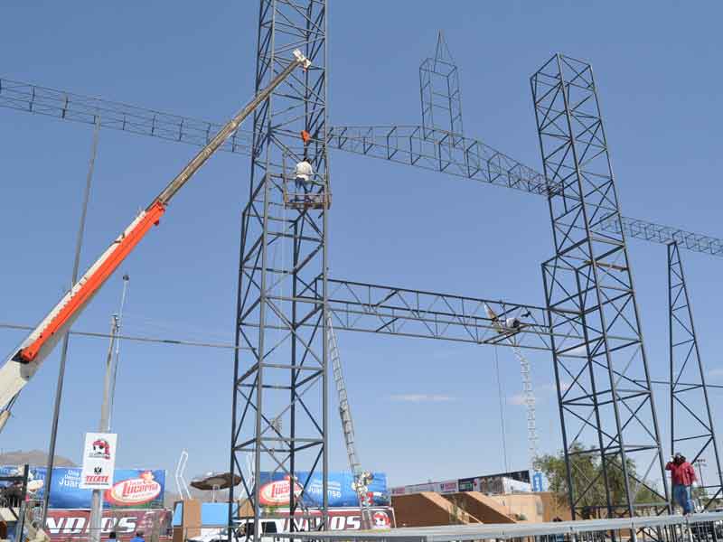 En el lugar, trabajadores levantan las estructuras que se utilizarán para el evento que encabezará mañana la presidenta de México