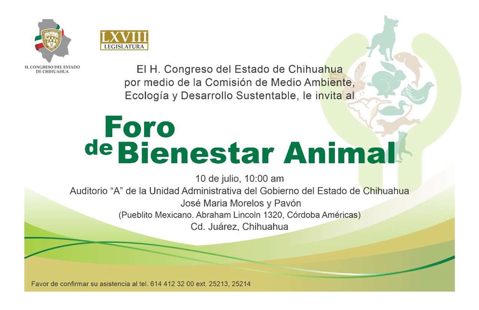 La Comisión de Medio Ambiente, Ecología y Desarrollo Sustentable del Congreso de Chihuahua realizará el foro de Bienestar Animal, en punto de las 10 de la mañana, este jueves 10 de julio, en el auditorio de las oficinas administrativas de Pueblito Mexicano.