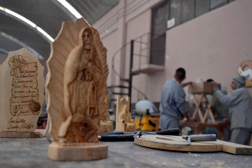 Pinturas al óleo de imágenes religiosas, cajas de madera, piezas de ajedrez, artículos de herrería y hasta esculturas talladas en madera de la Santa Muerte son elaboradas por 60 PPL que se han sumado al programa de reinserción a través de la artesanía y las manualidades.