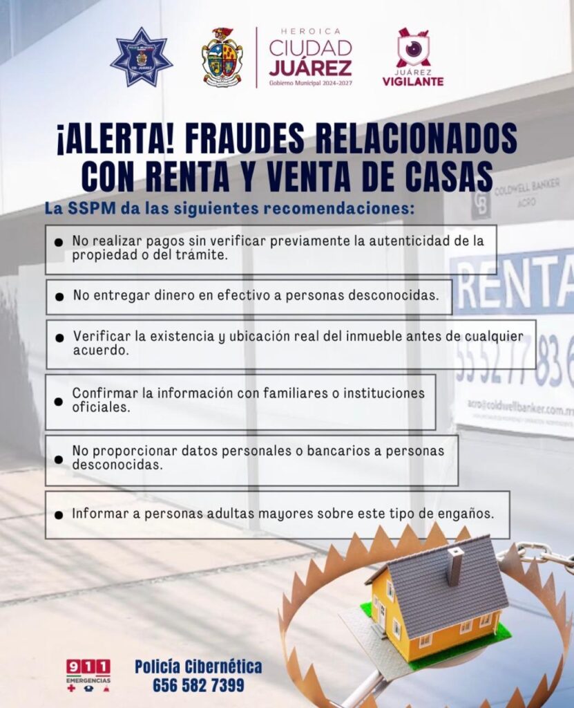 Ciudadanos que se encuentren en busca de alguna propiedad para rentar o comprar, deben extremar sus precauciones ante una nueva modalidad de fraude donde las víctimas están en búsqueda de negociar en el campo de bienes raíces, advirtió personal de la Secretaría de Seguridad Pública Municipal (SSPM).