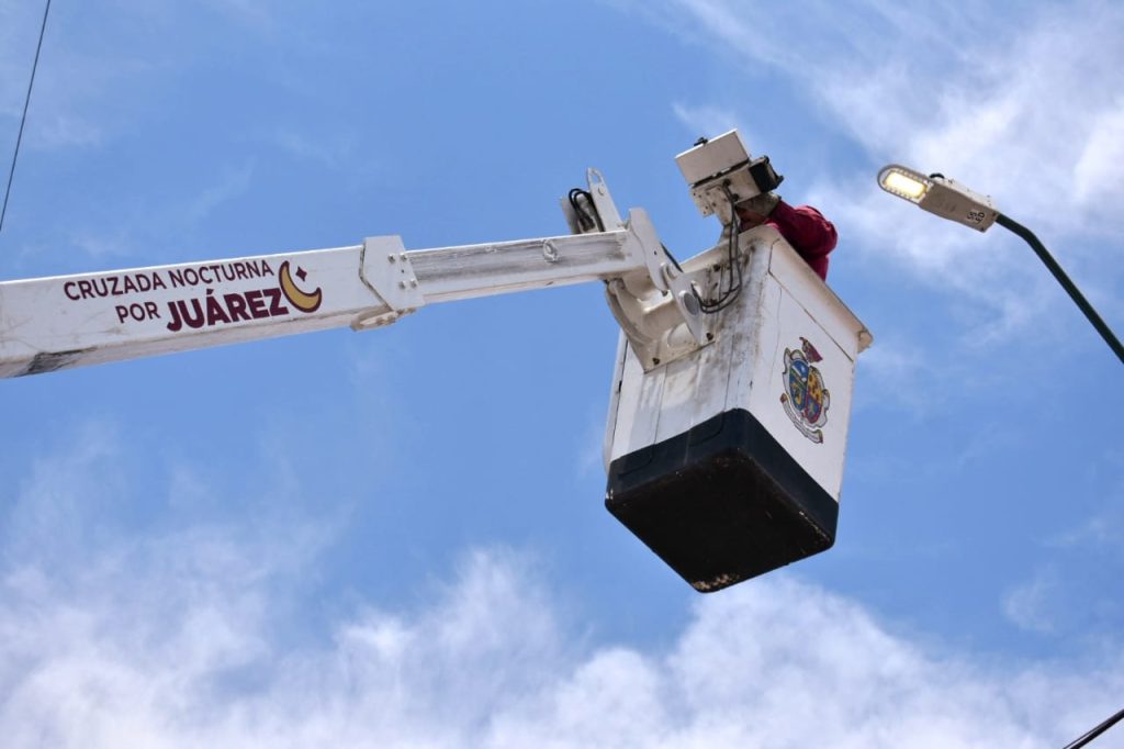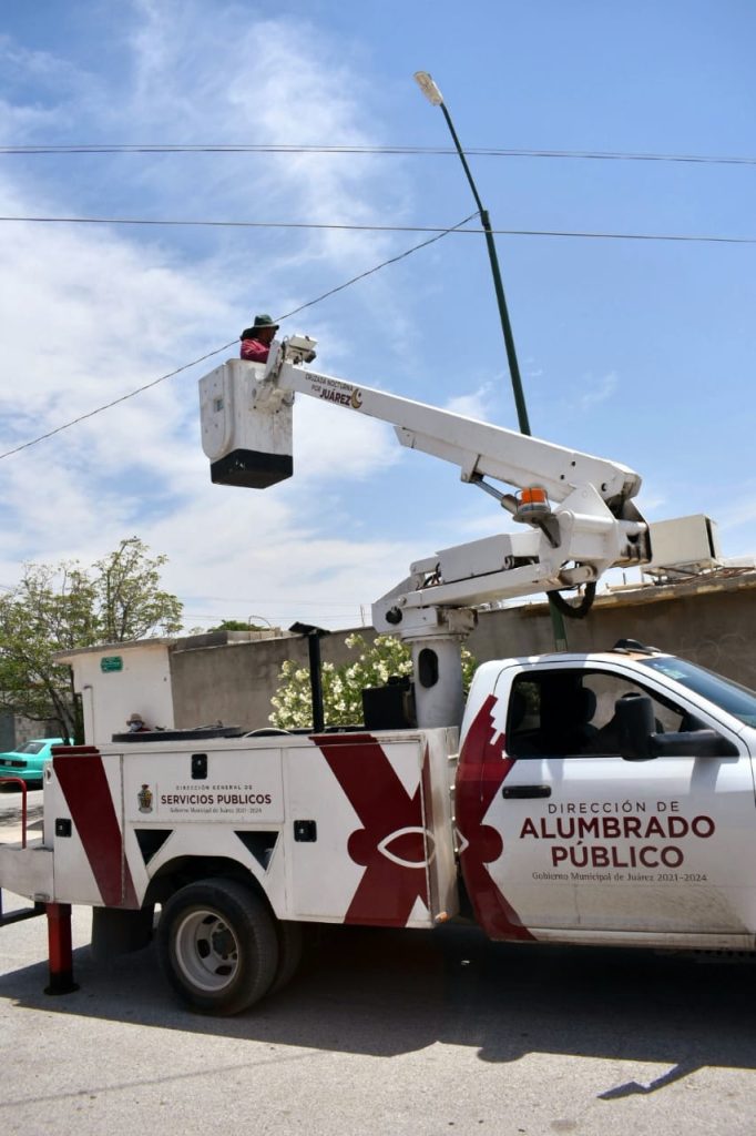Empleados de la Dirección de Alumbrado Público trabajan en la rehabilitación y mantenimiento de la infraestructura eléctrica para el funcionamiento de luminarias de las colonias Oasis Revolución, Americano, Colinas del Sur y Primero de Mayo, se informó a través de comunicado de prensa.