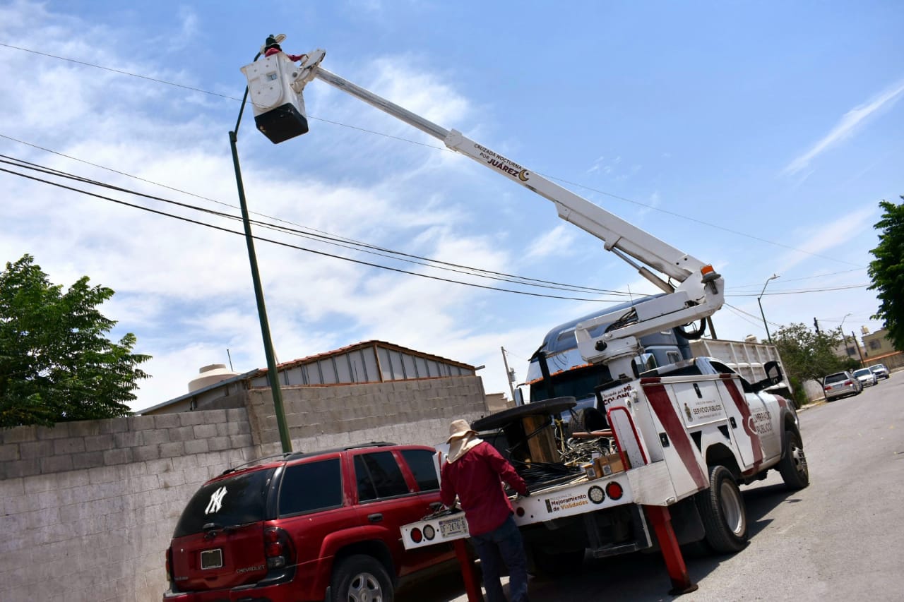 Empleados de la Dirección de Alumbrado Público trabajan en la rehabilitación y mantenimiento de la infraestructura eléctrica para el funcionamiento de luminarias de las colonias Oasis Revolución, Americano, Colinas del Sur y Primero de Mayo, se informó a través de comunicado de prensa.