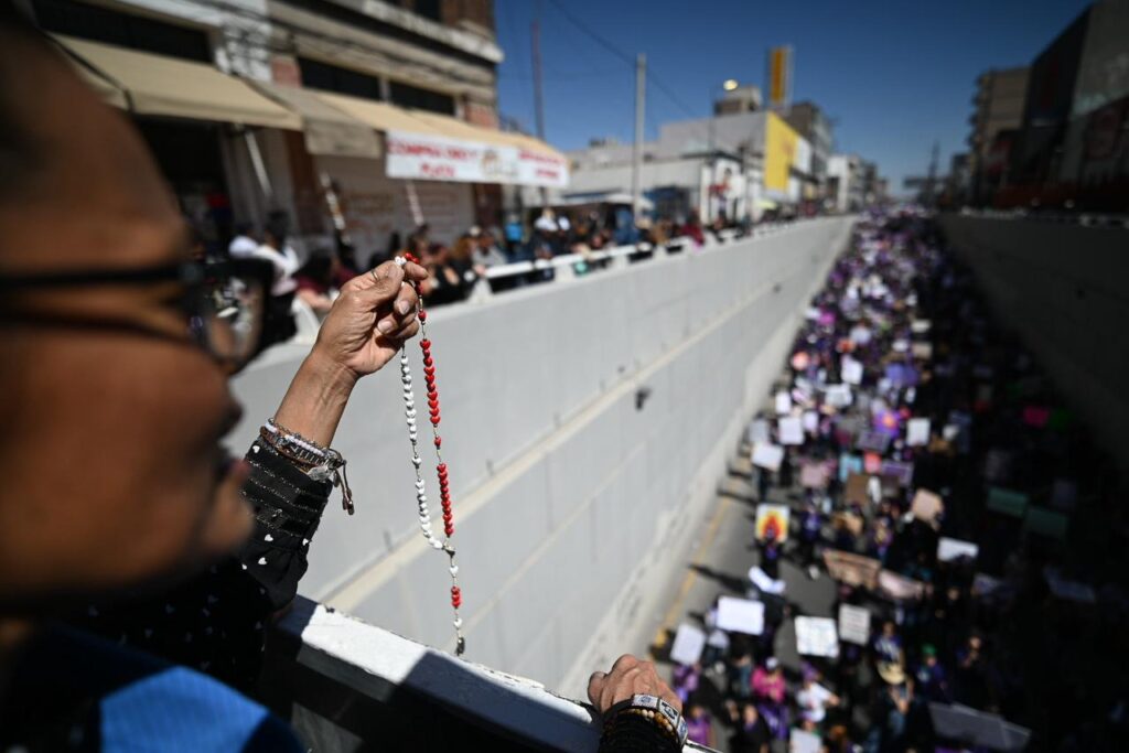 Cuando la caravana avanzaba precisamente por ese lugar, una mujer colocó en la parte alta un rosario, como si fuera una especie de protección contra algunas ideas o acciones de las manifestantes.