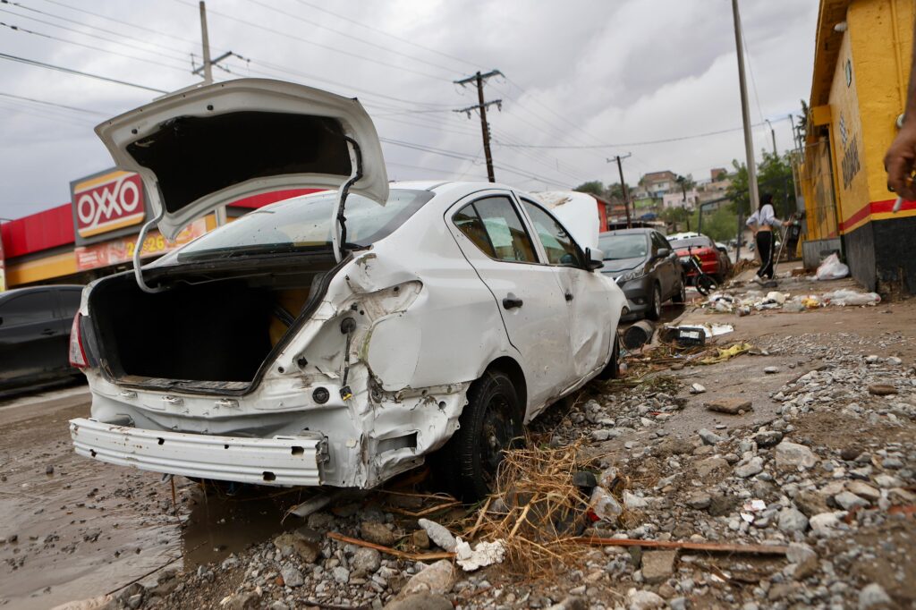 En ese punto también confluyeron automóviles que fueron arrastrados por el caudal que se formó, provocándoles diversos daños, reportaron ciudadanos en ese lugar.