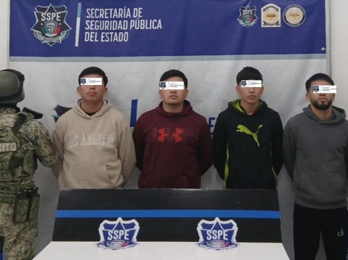 Datos de la Secretaría de Seguridad Pública del Estado (SSPE), indican que durante la noche del pasado martes se realizó el rescate de un grupo de cinco migrantes, así como la detención de Jair Iván R. V., Joel Leonel S. L., Ulises Roberto A. M. y Jareth R. V., por la probable comisión del delito de tráfico de personas.
