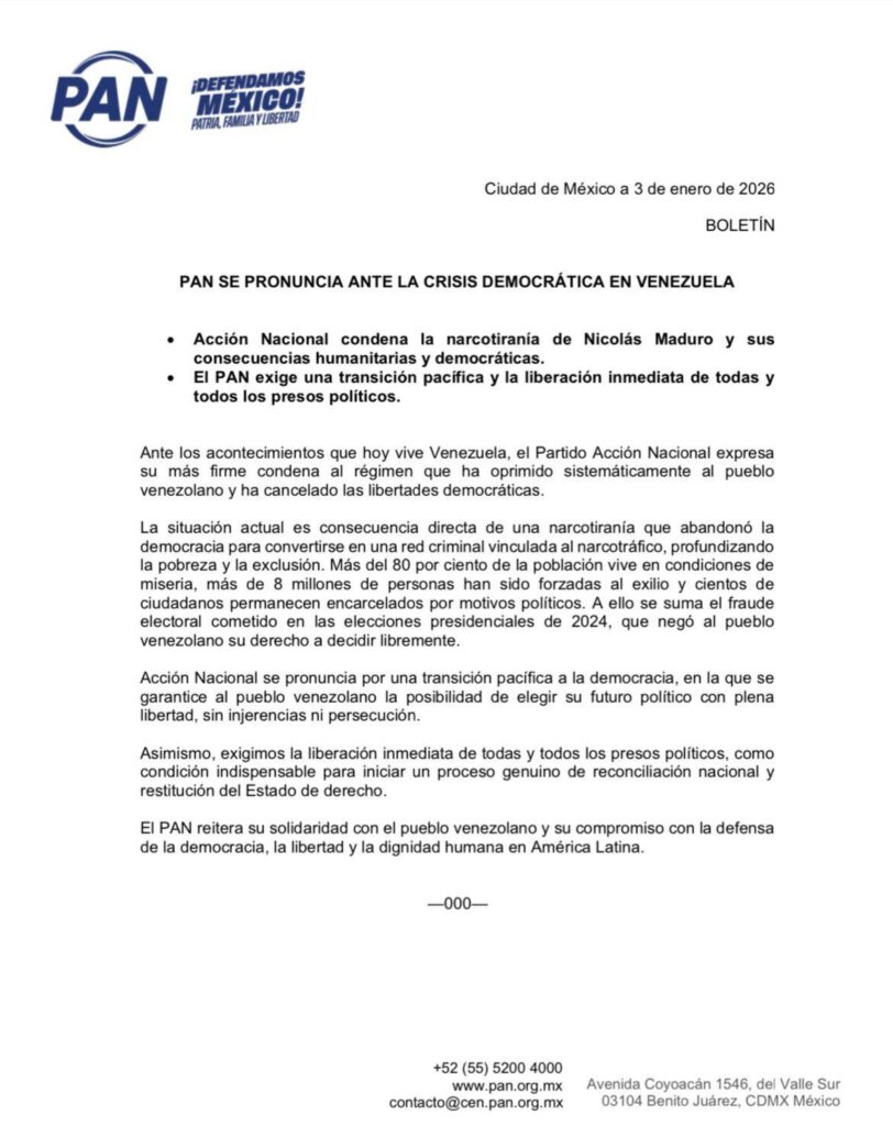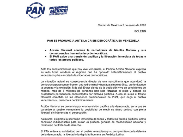 Finalmente, el PAN reiteró su solidaridad con el pueblo venezolano y su compromiso con la defensa de la democracia, la libertad y la dignidad humana en América Latina.