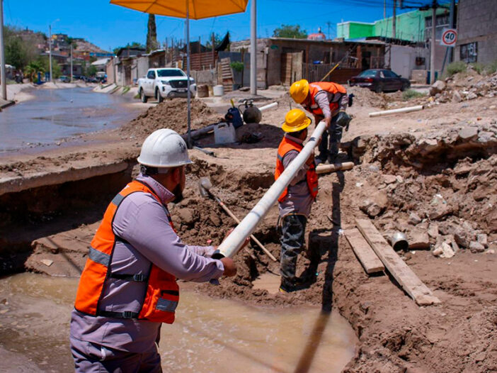Los trabajos se extendieron al cruce de las calles Emiliano Zapata y Santiago, en la colonia Francisco Sarabia, donde la tormenta dejó severos daños, particularmente en la infraestructura de agua potable y alcantarillado