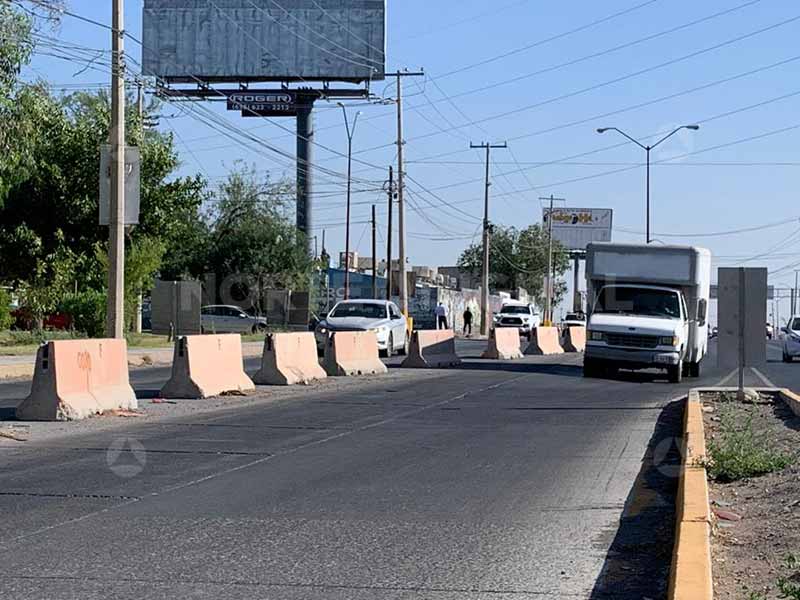 Son dos tramos los que permanecen bloqueados, uno más próximo a la avenida Manuel Clouthier y otro justo en donde se marca la salida de la avenida De las Torres hacia la calle Sorgo. En el primero se encuentran instalados 12 muros de contención y en el segundo otras diez piezas de concreto.