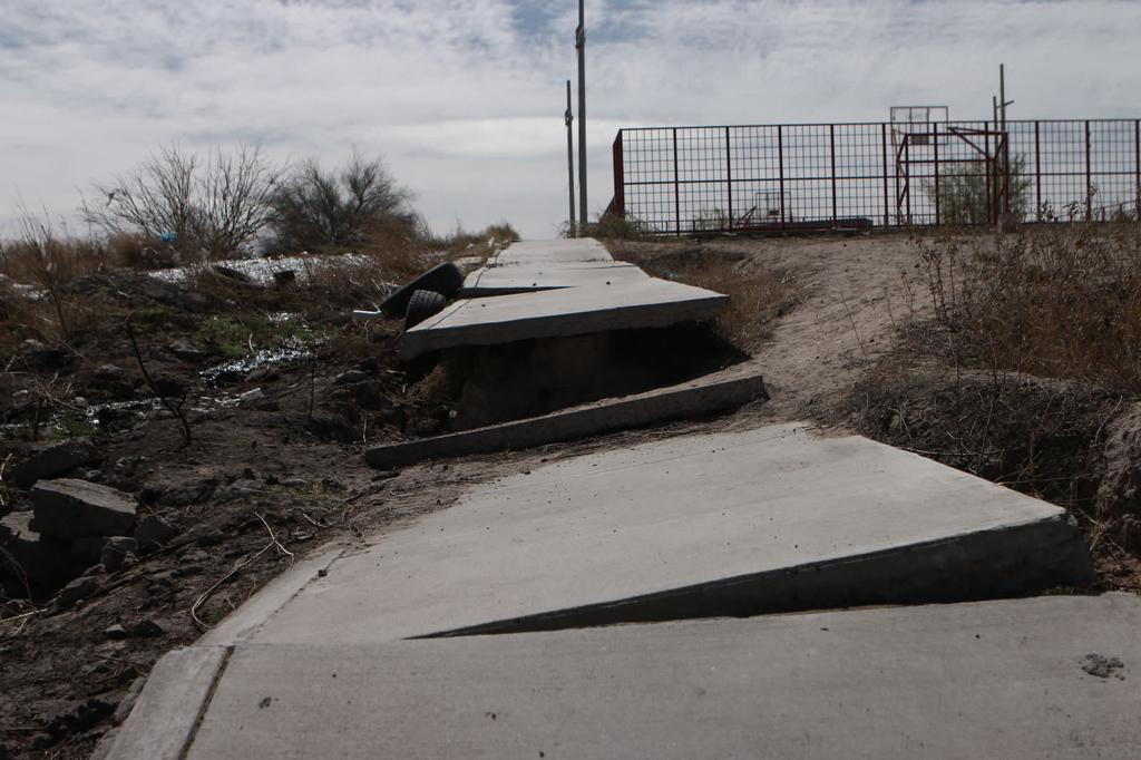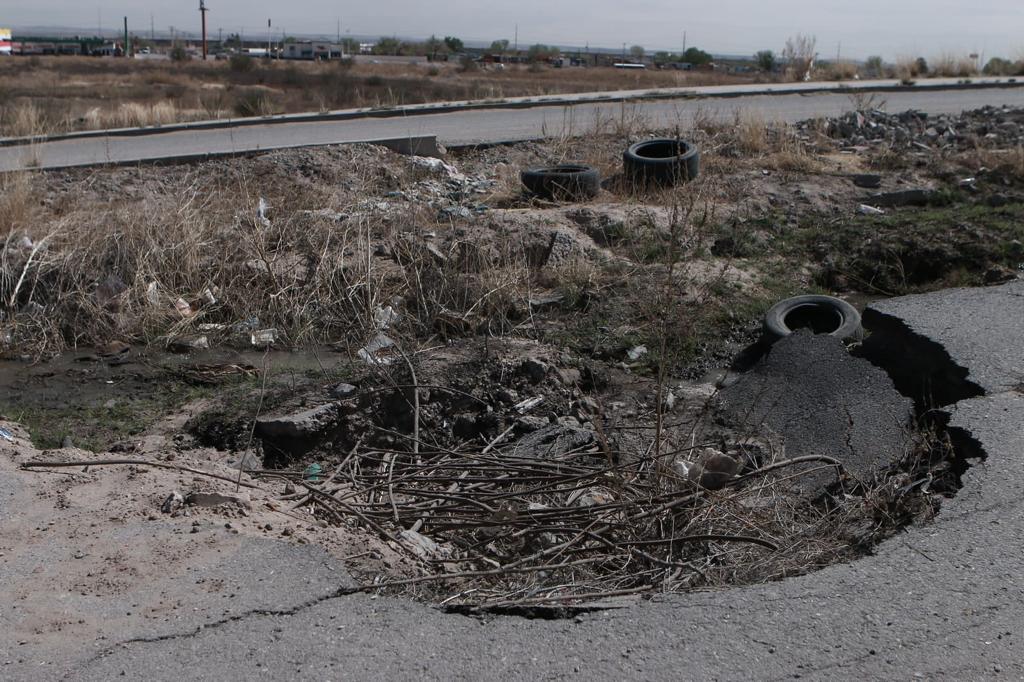 Lo que debería ser una banqueta parece ser una escalera peligrosa, con peldaños entre los cuales se aprecian más basura, telarañas, llantas y excremento de animales. En uno de sus lados, se ven inquietantes hendiduras en el suelo por las que fácilmente podría caber una persona adulta.