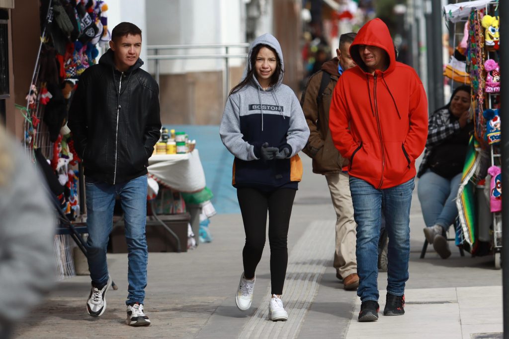 Un recorrido de Norte Digital por varias partes de la ciudad, muestra niños y adultos protegiéndose de las primeras bajas temperaturas de la temperatura.