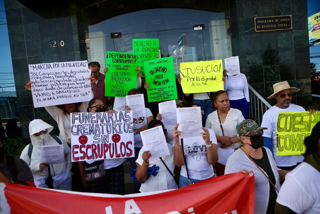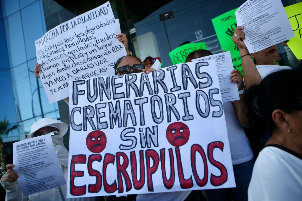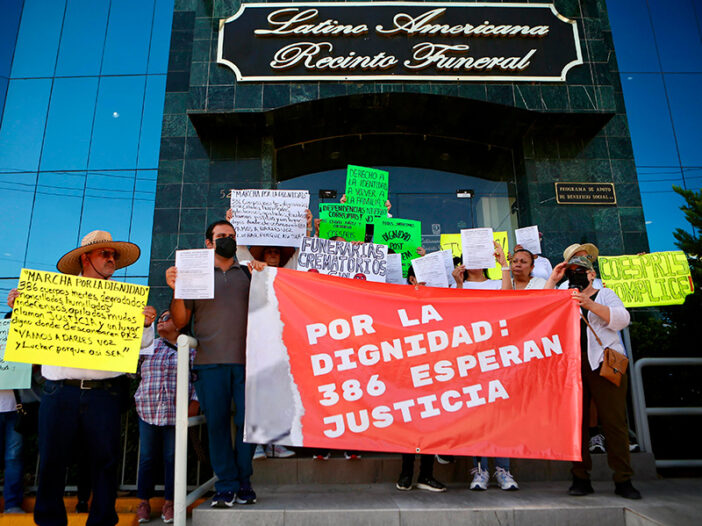 Los manifestantes comenzaron sus protestas concentrándose en la funeraria Latino Americana, lugar en el que la mayoría de los deudos participantes contrataron los servicios funerarios.