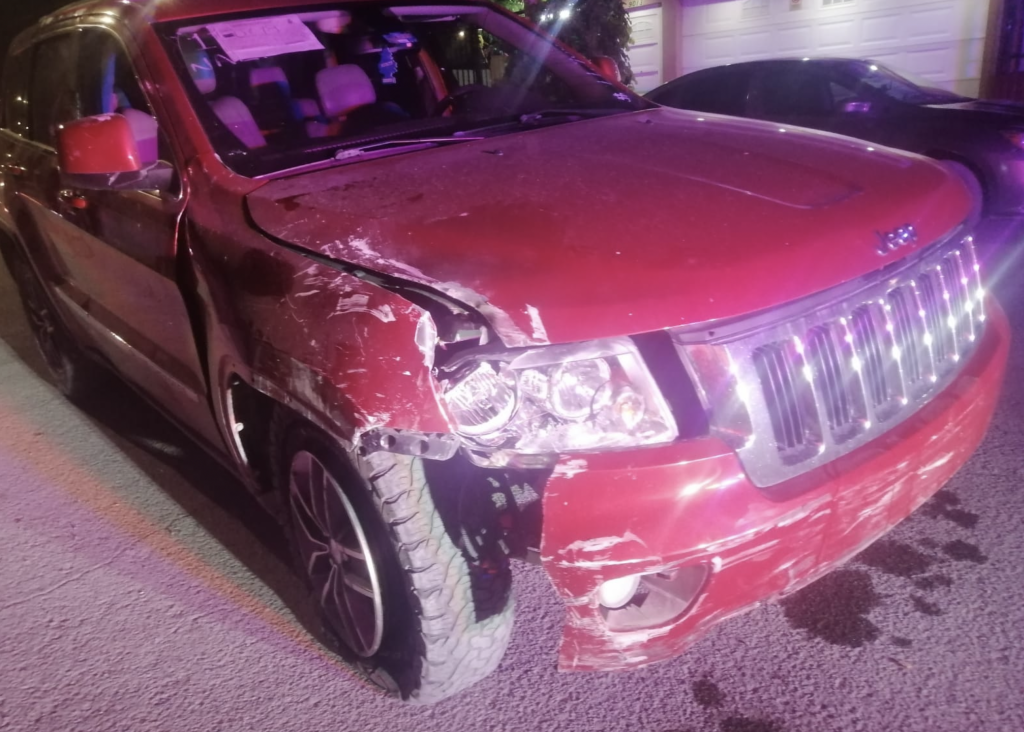 Un vehículo marca Jeep modelo 2011 color rojo cuyo conductor se dio a la fuga, provocó una colisión con un auto Kia Rio modelo 2023, color rojo.