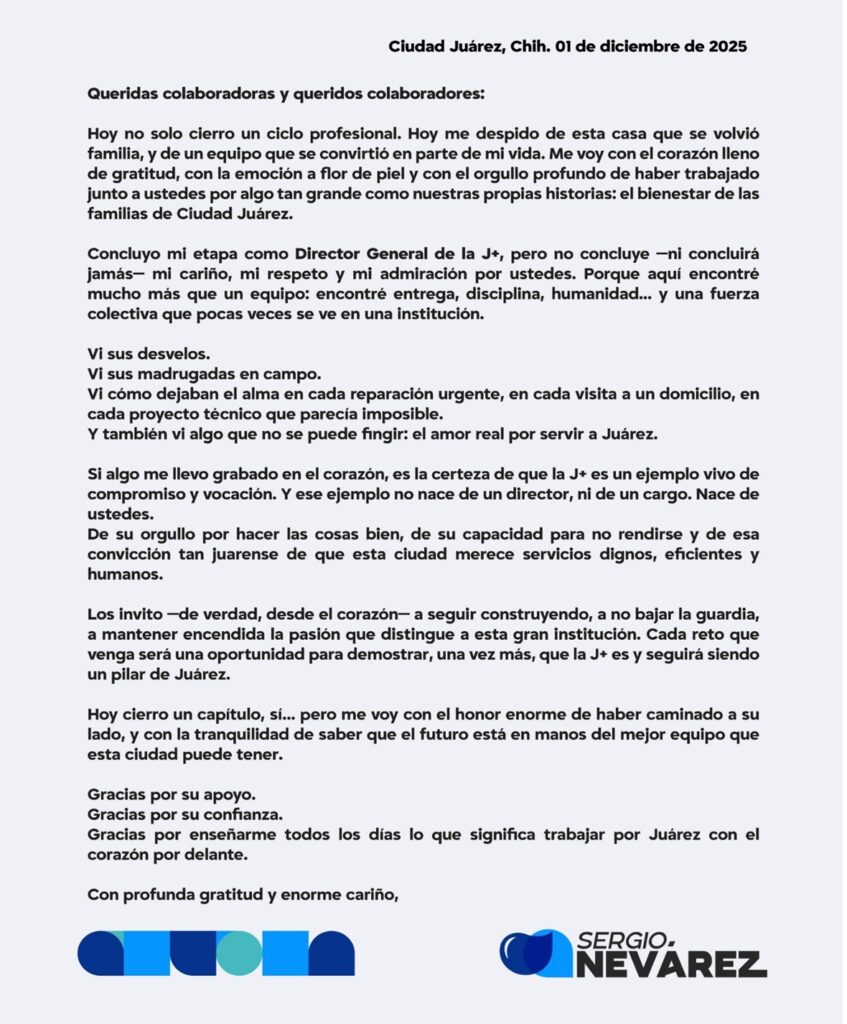 A través de una carta enviada a los empleados de la Junta Municipal de Agua y Saneamiento de Juárez (JMAS), se despidió este lunes Sergio Nevárez Rodríguez, quien durante los últimos cuatro años ocupó el cargo de director ejecutivo del organismo operador del agua en esta frontera.