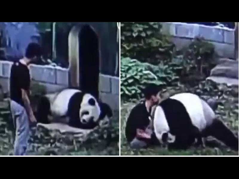 Las imágenes muestran cómo el hombre pasó casi cinco minutos de desesperación intentando liberarse del panda de 265 libras, quien sujetaba y mordía su pierna