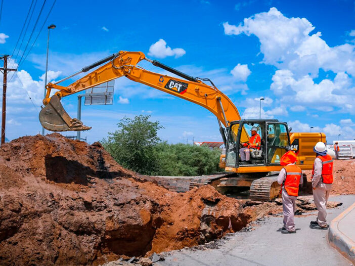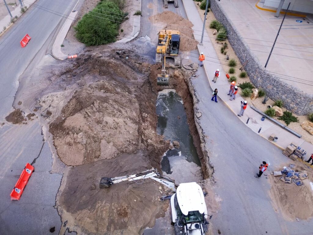 Ante el hundimiento del colector Candelaria de Waterfill, avería provocada por el desgaste de una tubería de concreto que llegó al final de su vida útil, personal de la Junta Municipal de Agua y Saneamiento (JMAS) de Juárez trabaja en su reparación.